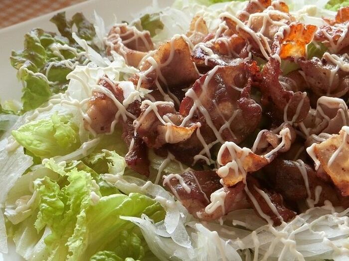 レタス、新玉ねぎ、豚バラ肉を盛り付けます。飾り用マヨネーズかけたら完成♪
