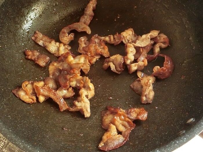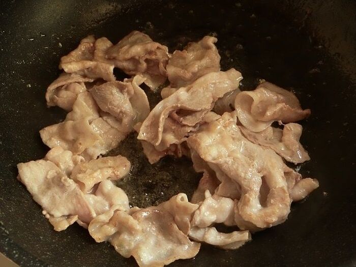 フライパンにマヨネーズを入れ、豚バラ肉を炒めます。