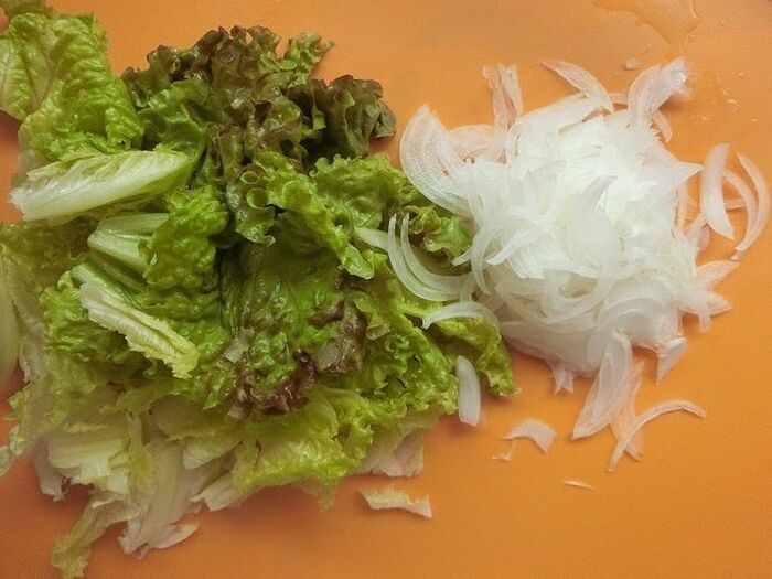 サニーレタスは一口大に切り、新玉ねぎは薄くスライスします。