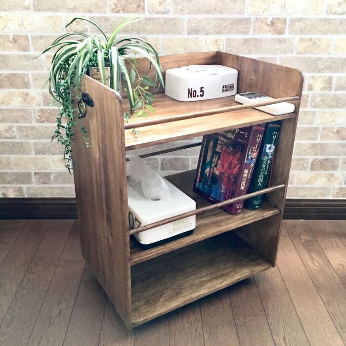 棚の両サイドに取手を付け、底面の裏側に4ヶ所キャスターを取り付ければ出来上がり♪