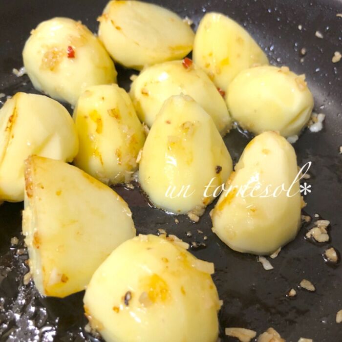 同じフライパンにオリーブオイルとにんにく・唐辛子を入れて熱し、香りが出たらじゃがいもを入れて油を絡める。《弱火→中火〜弱火》