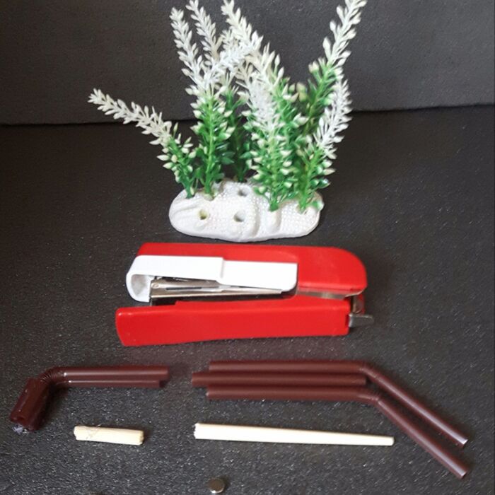 (ストローの片側の中心に磁石を差し込んでから最後に先端部分をとめる。)