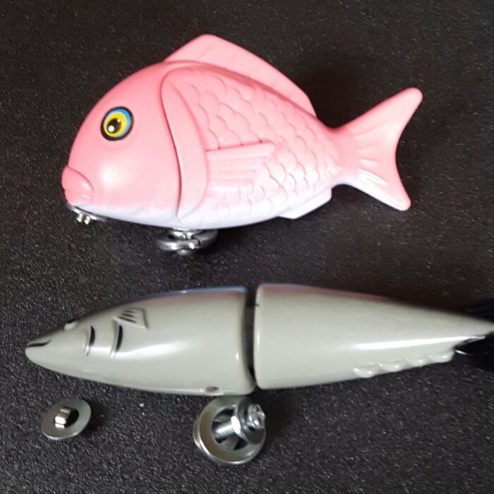 ① 魚のあごのあたりに小さな強力磁石をグルーガン等で接着する。