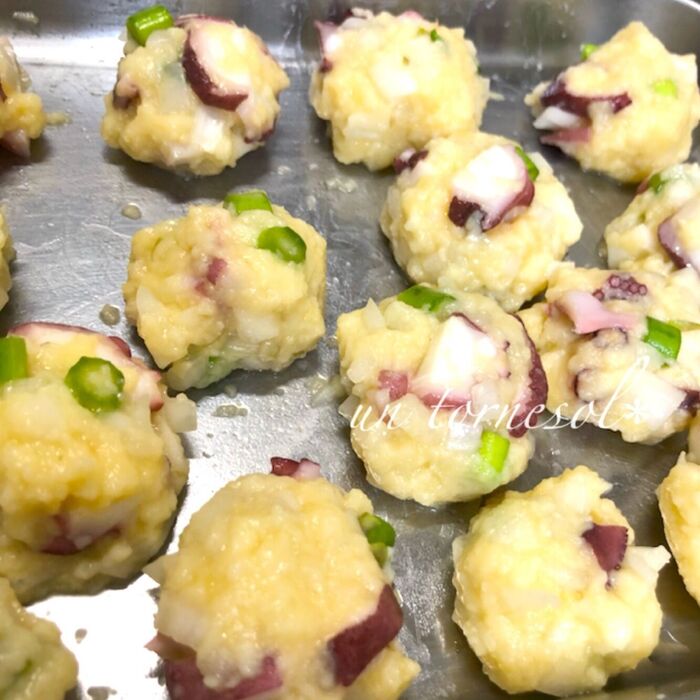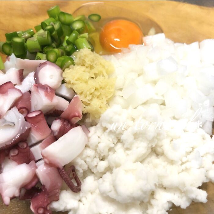 はんぺんはよくつぶして、タコとアスパラ・玉ねぎ・しょうが・卵・☆をよく混ぜ合わせ、一口大に丸める。