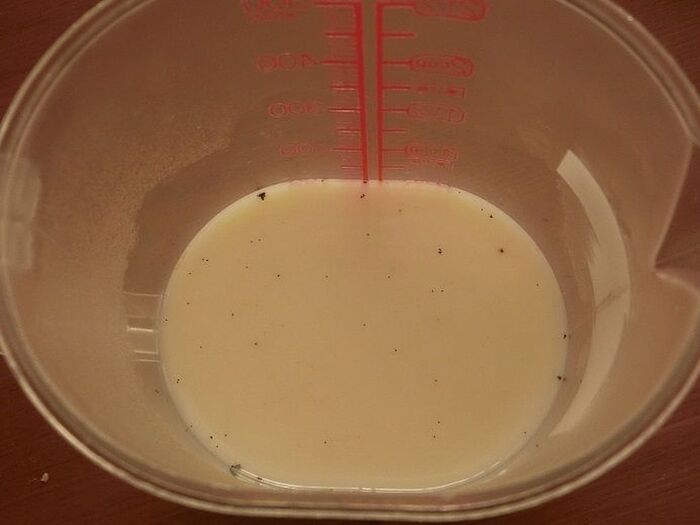 牛乳とバニラビーンズをさやごと耐熱容器に入れて、電子レンジ600wで1分加熱します。