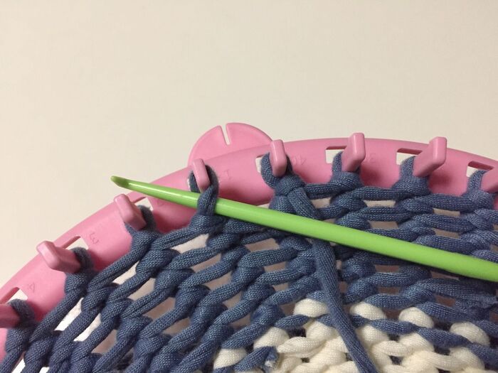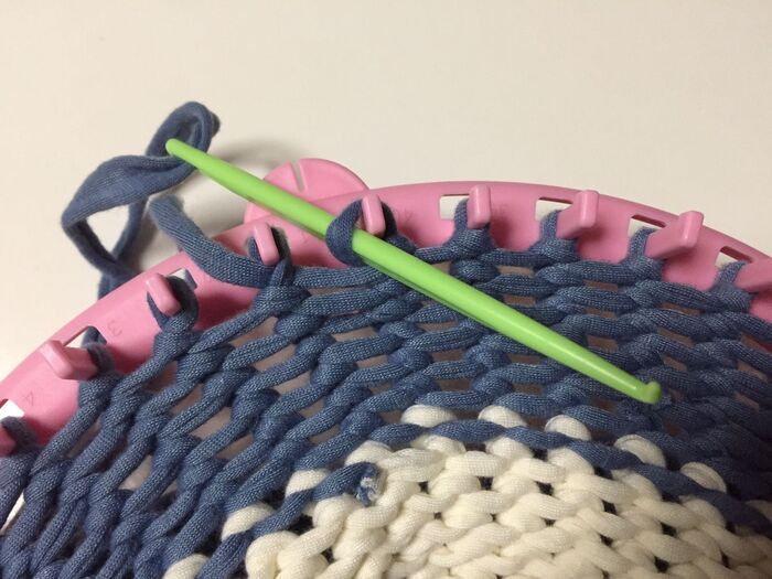 ニット帽メーカーにTシャツヤーンを掛け、裏の編み方に従って側面を編みます。