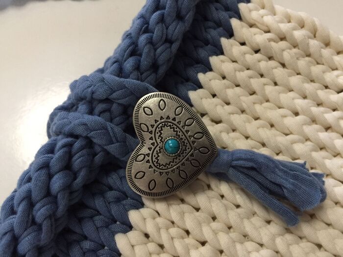 Tシャツヤーン3本で三つ編みをし、裏面から通してボタンにかけます。