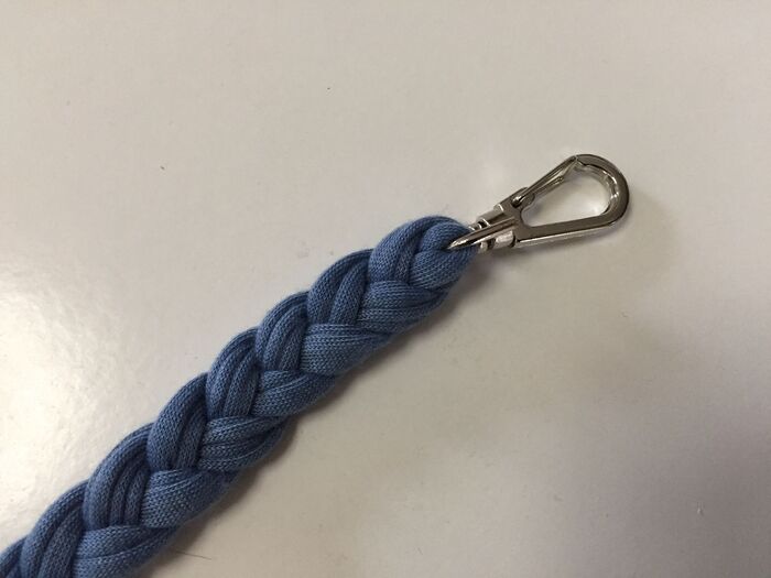 ナスカンにTシャツヤーンを3本通し三つ編みをします。