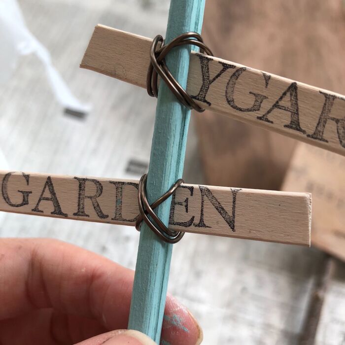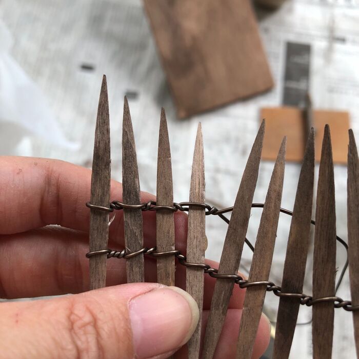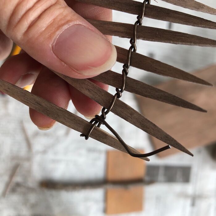 割り箸の割れ目にアイスの棒を挟んで、一本ずつ針金でぐるぐる固定します。