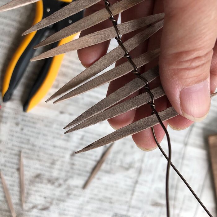 次の楊枝を針金で挟み、同じく根元を抑えてねじります。