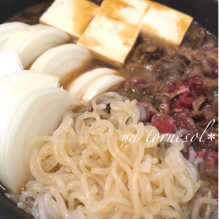 フライパンに①を入れて火をつけ、沸騰したら豆腐と玉ねぎ・糸こんにゃく・酒を入れて加熱し、火が通ったら牛肉は取り出し、約10分ぐらい煮込む。《中火→中火〜弱火》