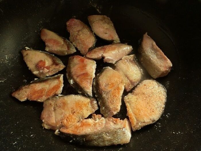 フライパンにバター大さじ1と鮭を入れます。両面きつね色になるまで焼き、取り出しておきます。