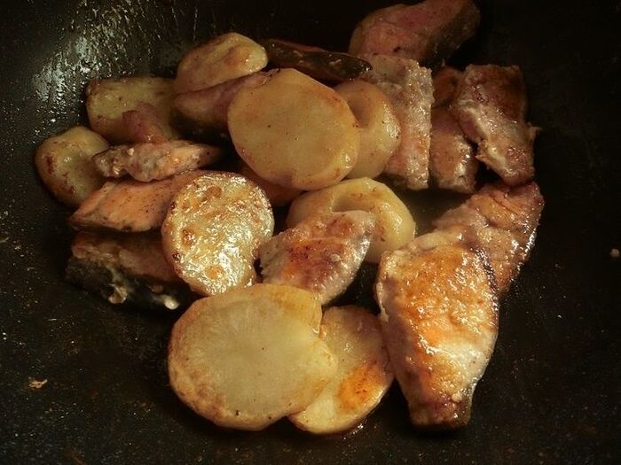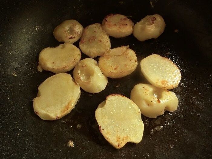 残りのバターとじゃが芋をフライパンに入れ、両面きつね色になるまで焼きます。