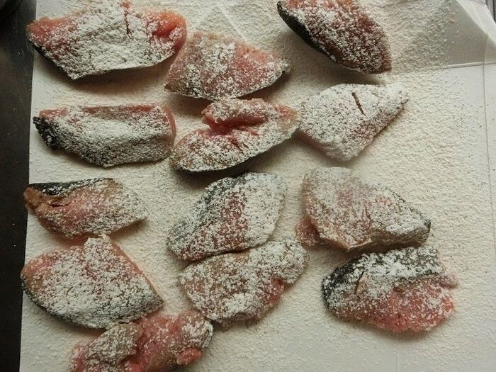 鮭は3等分にします。両面に塩こしょうをふり、薄力粉をまぶします。