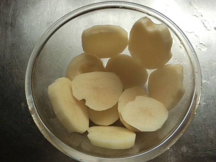 じゃが芋は皮をむいて1㎝の輪切りにします。耐熱容器に入れてふんわりラップをかけ、電子レンジ600wで3分加熱します。