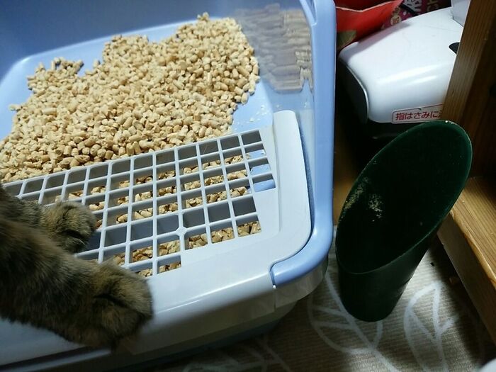 猫トイレの砂を掻いて、おしっこで湿って粉末化した猫砂をすのこ下に落としたり、うんちをすくい取るのに使います。