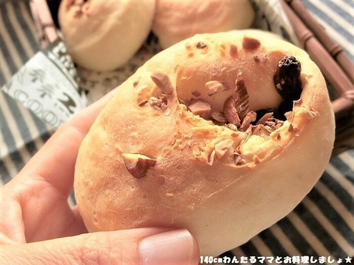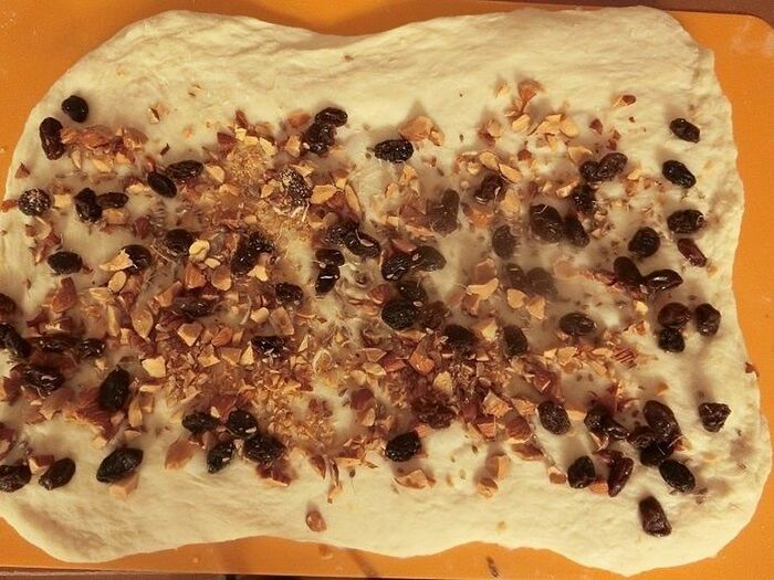 縦20㎝、横30㎝に伸ばして、アーモンド、レーズン、アニスを広げます。端から巻いていき、巻き終わりをしっかりとめます。