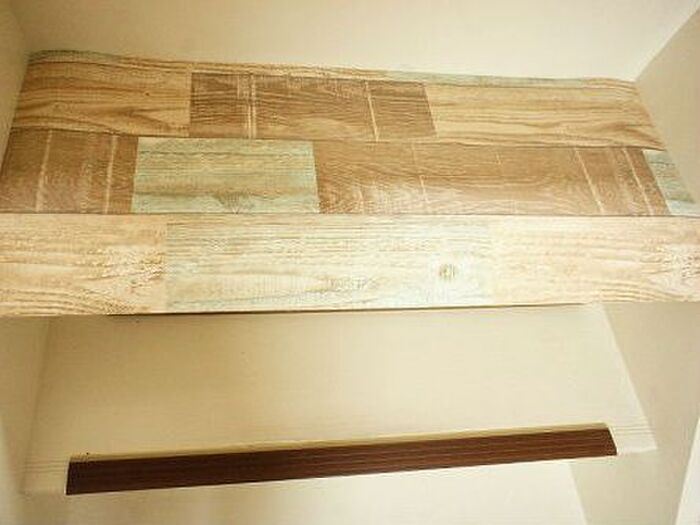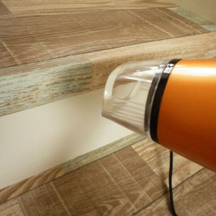 踏み板の部分だけに貼るとクッションフロアの切断面が見えて見た目的によくないいので、折って貼り付けたんだけど、この時期、ドライヤーはキツイです(笑)