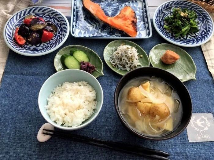 炊き立てご飯と 鮭のカマ ナスと赤ピーマンの揚げびたし 青菜の胡麻和え シラスと山椒 梅干し