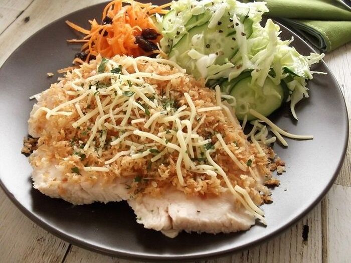 カリカリパン粉・チーズ・乾燥パセリをかけて完成!