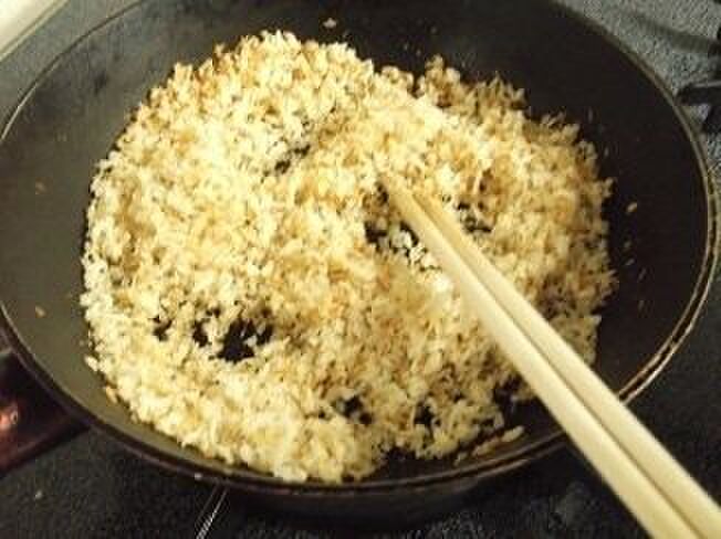 菜箸で混ぜたり、フライパンをゆすったりしながら、7割ほど茶色くなるまで炒める。