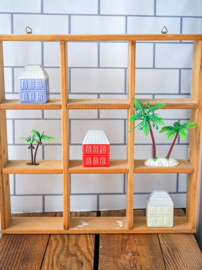 早速棚に飾ってみました。いつも玄関にあるインテリアラックに飾ってみました。ヤシの木も100円で買った物です。ほっこりした家のデザインが私好みです。