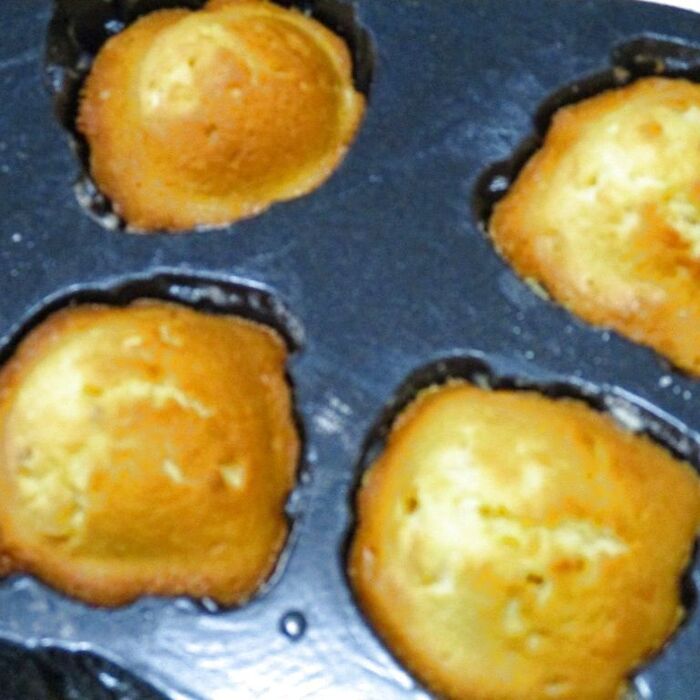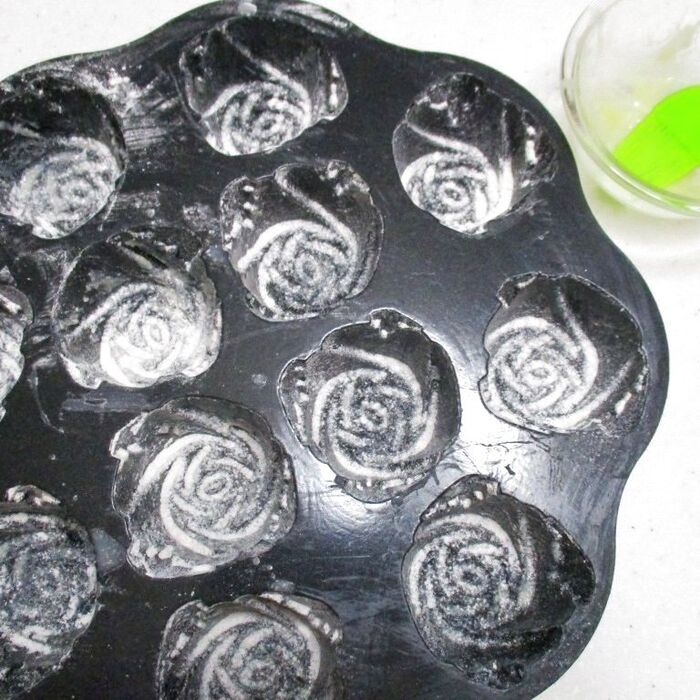 型は、バターを刷毛などで塗り、分量外の薄力粉を型の内側に薄くふりかけておき、冷蔵庫に冷やしておく