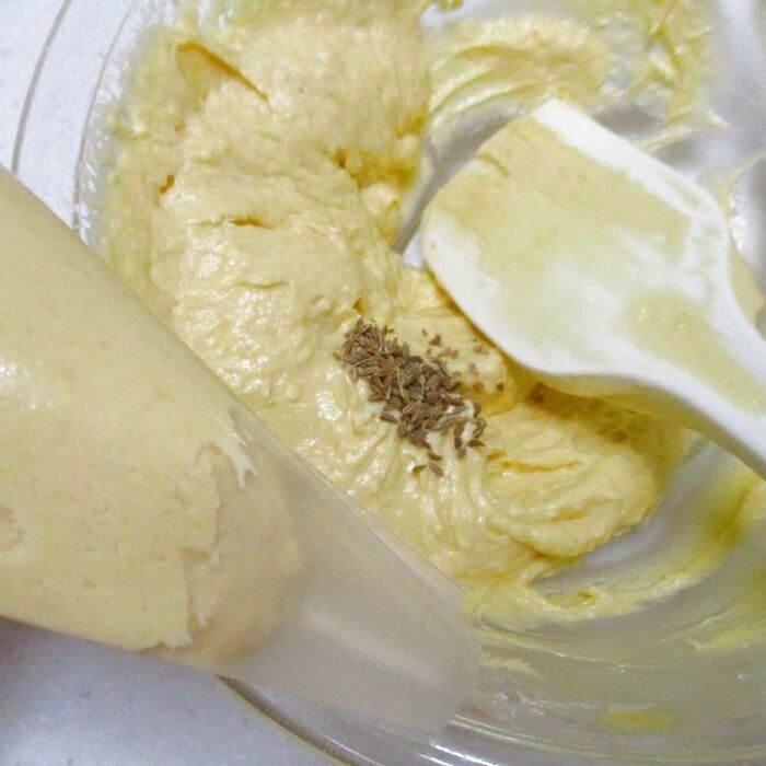 あとの、残りに、ギャバンアニス<ホール>小匙1/2を加え混ぜています、絞り袋に入れて、型にしぼり出し