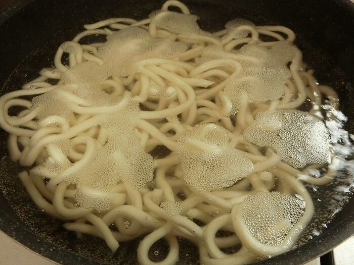 ソースは温める程度で、すぐにうどんを混ぜ合わせます。