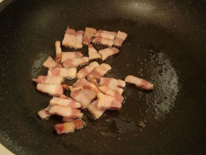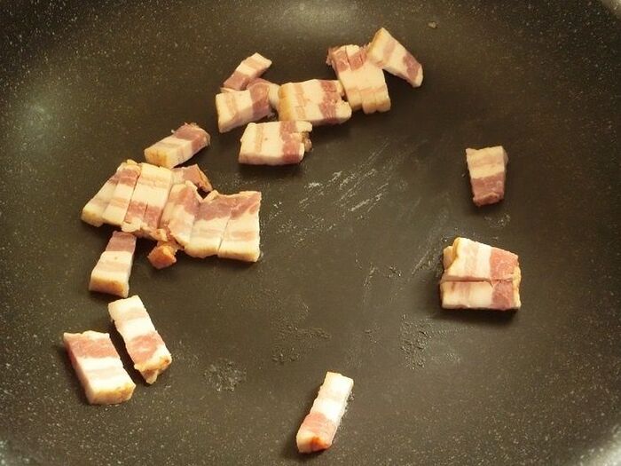 ベーコンは厚さ1㎝の細切りにします。フライパンで炒めます。