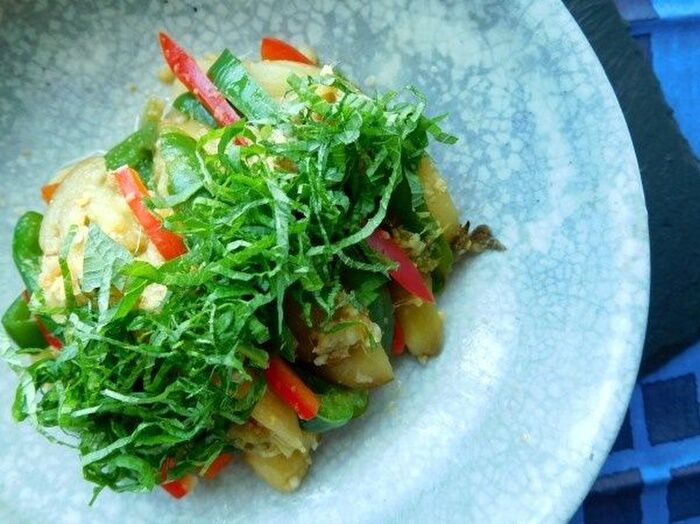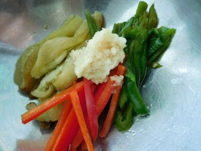 焼けたピーマンと茄子は皮をむき 半分に切ってから縦に切り