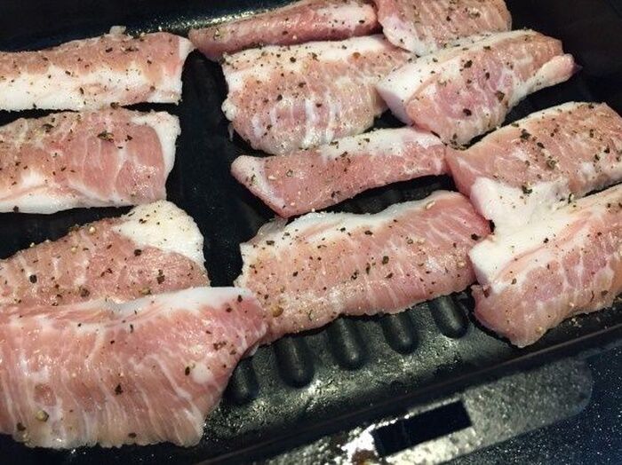 豚トロに塩・コショウをしっかりしてグリルパンで焼く