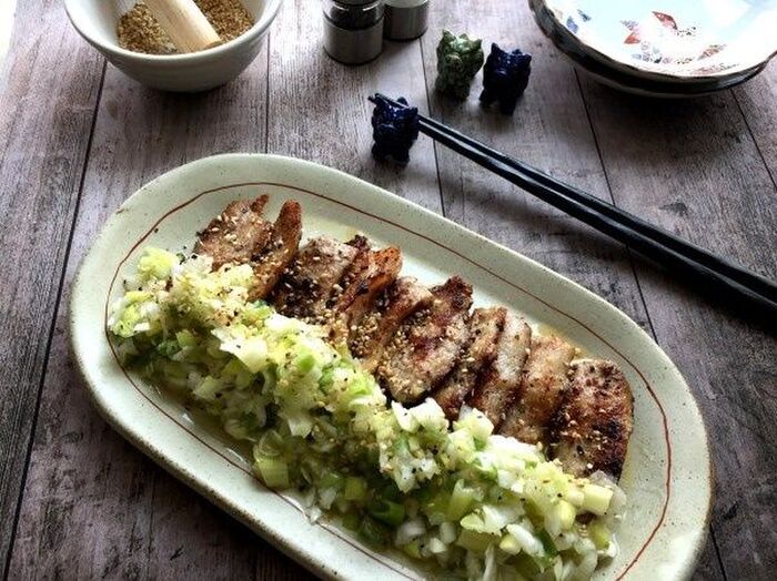 焼いた肉を器に盛り付けネギソースをたっぷり添え軽く擦った白ゴマとコショウを
