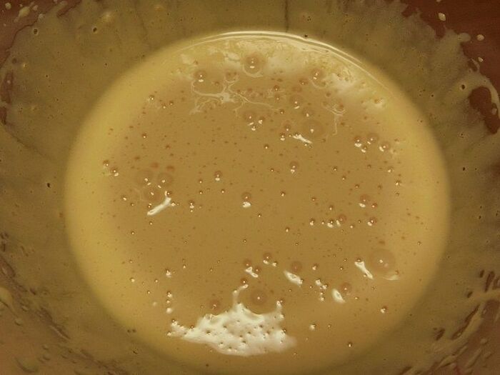 5に3を混ぜ合わせたら、米粉をふるいながら入れて混ぜ合わせます。