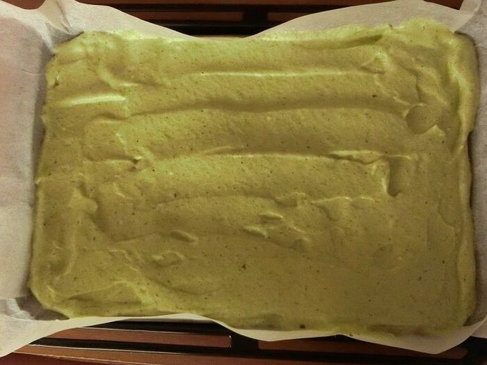 残りのメレンゲも混ぜ合わせ、クッキングシートを敷いた天板に、2㎝くらいの厚さで流し込みます。
