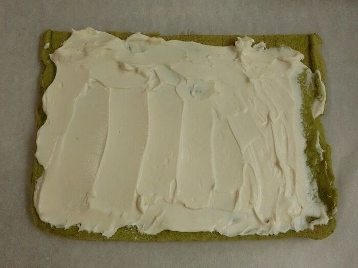 冷めた生地に2㎝くらいの間隔で横に軽く切り込みを入れます。1のクリームを塗り、端から巻いたら切り分けて完成♪