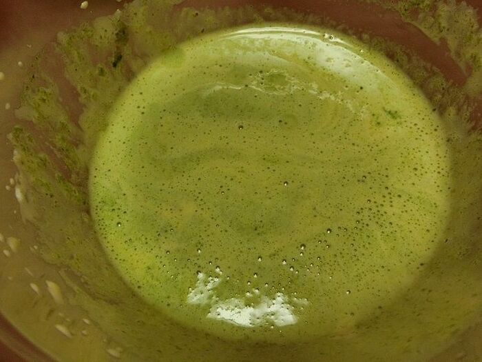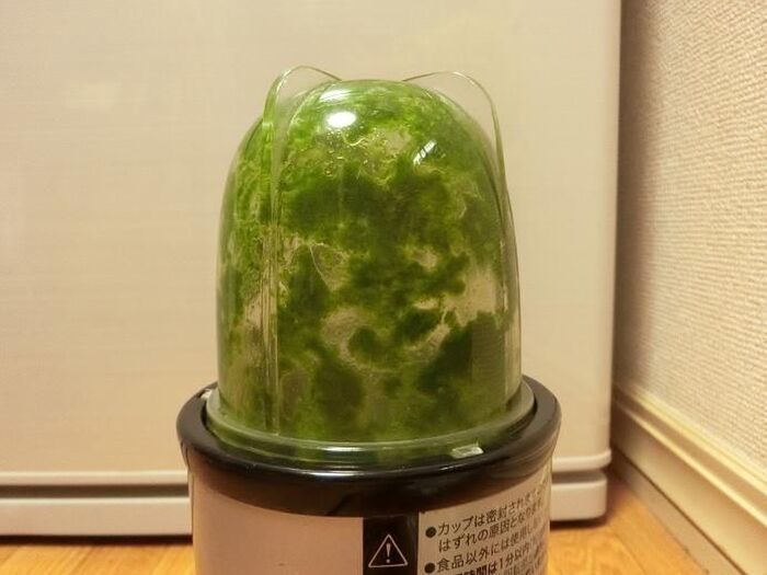 小松菜のあら熱が取れたら、細かく切ってミキサーでさらに細かくします。