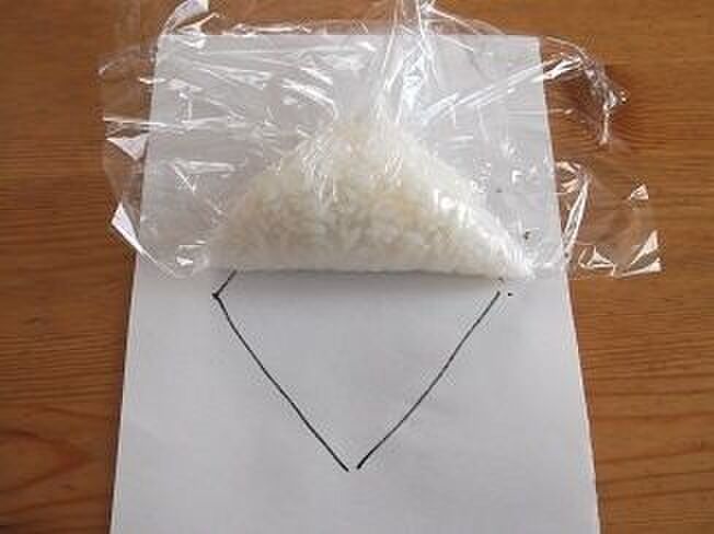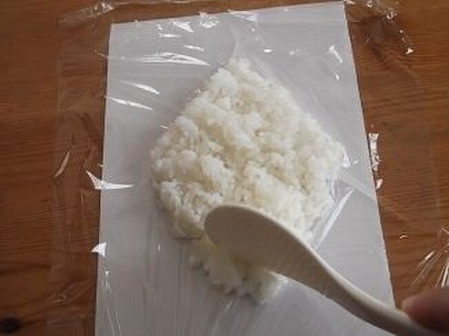 ご飯をのせたら、線をガイドにご飯を広げていく。