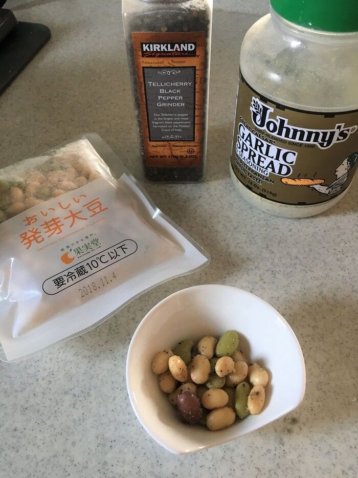 同じくコストコの人気商品「発芽大豆」にパラパラとふったら、もう止まりません。