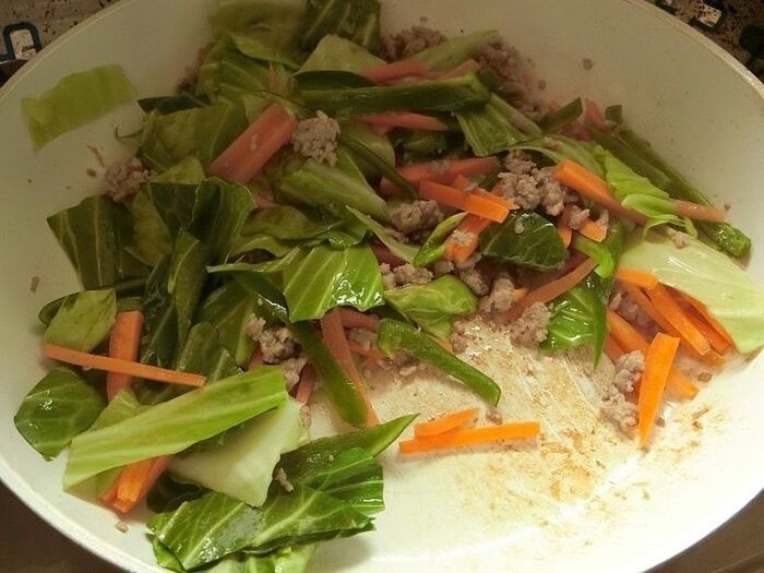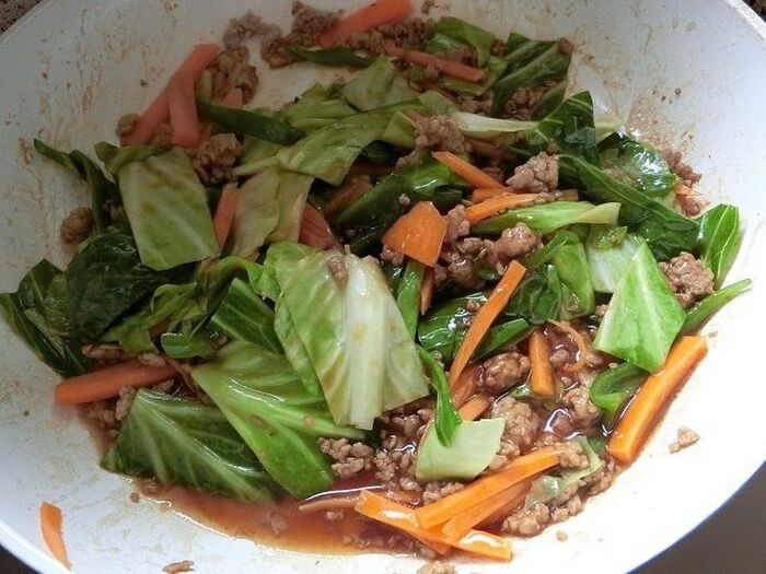 フライパンに油とひき肉を入れて炒め、色が変わってきたら1を入れて炒めます。