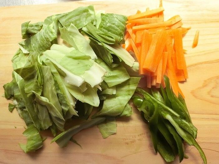 人参、ピーマンは細切りにし、キャベツは一口大に切ります。