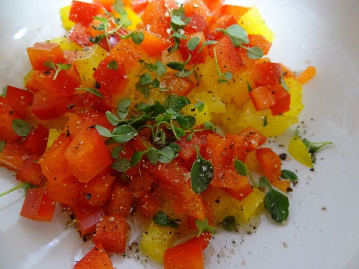 パプリカをセルクルに詰めて・・・・まわりにGreen caviarを置く。