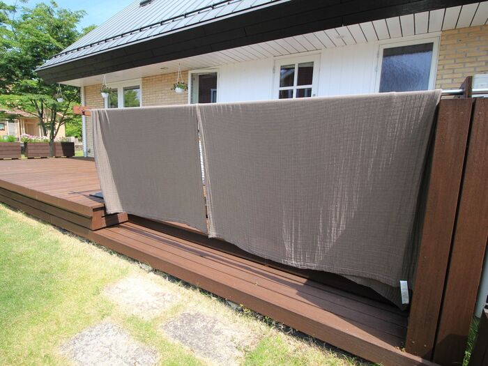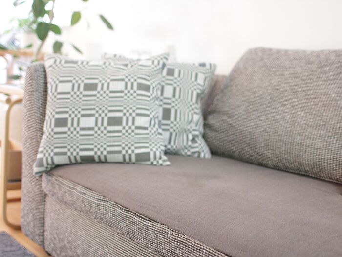 L字のソファーなので、シングルサイズのガーゼケットを2枚使っています。