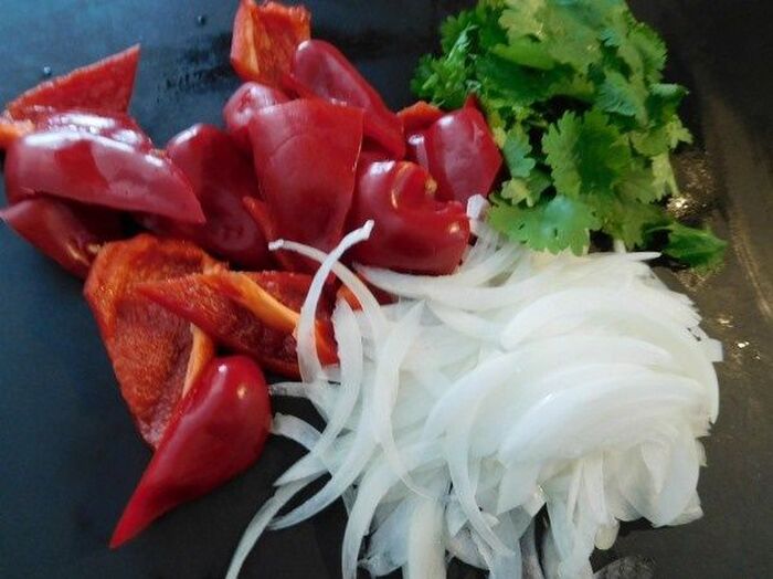 赤ピーマンは乱切り 玉ねぎは薄切りにする