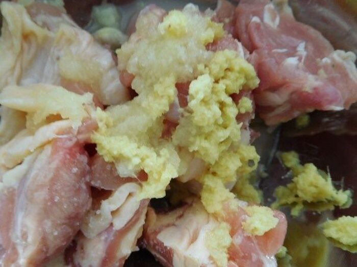 鶏肉は一口大に切りすりおろしたニンニクとしょうが