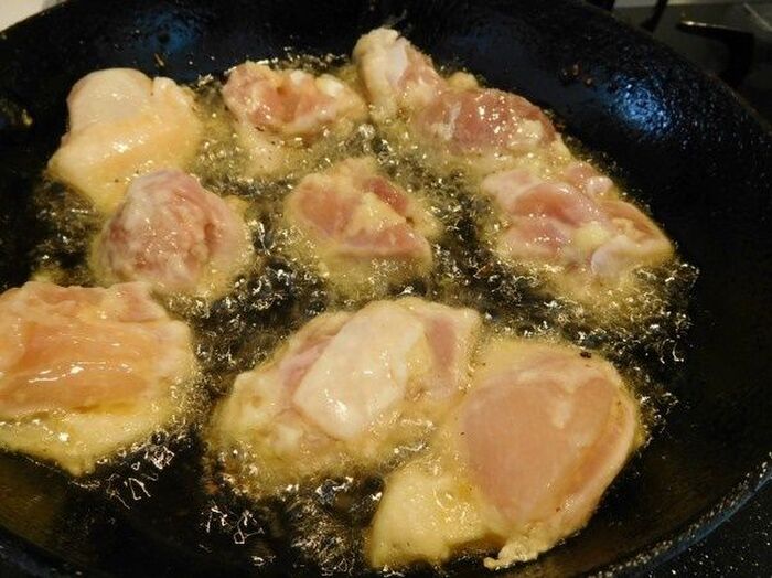 鶏肉に薄く片栗粉をまぶし揚げオイルで炒め揚げする