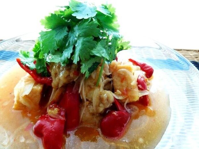 1/3のパクチーを入れ30分位漬け込み 漬けタレごと器に盛り付け