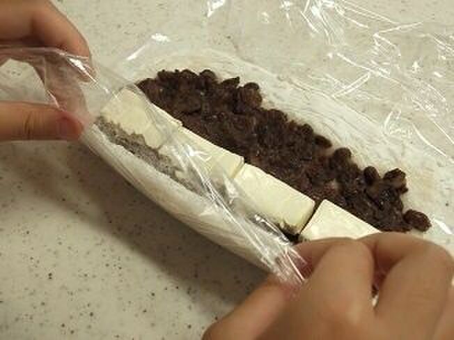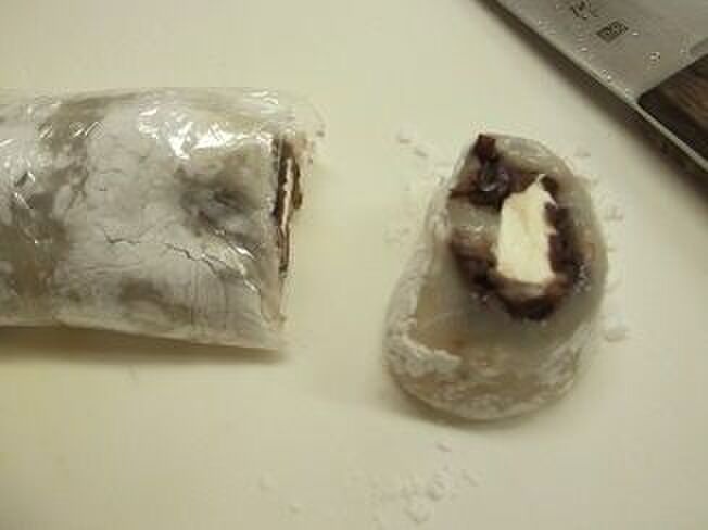 巻き終わりを残してあんこを塗り広げ、半分に切ったクリームチーズを並べる。