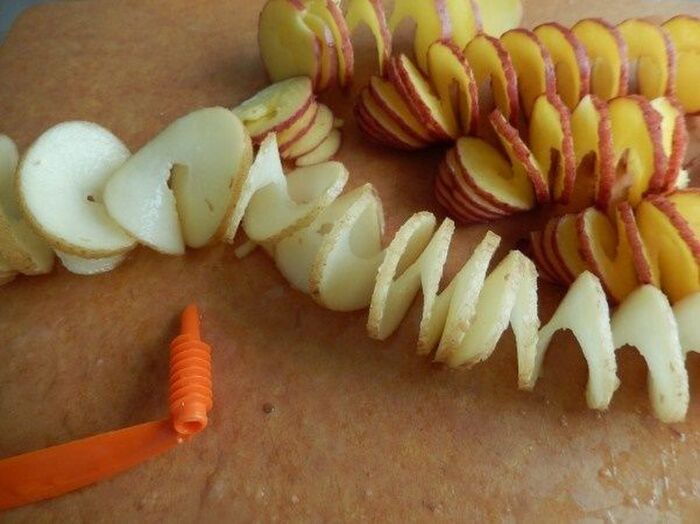 ジャガイモを くるりんカッターでらせん状に切り しばらく水に漬ける