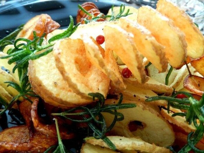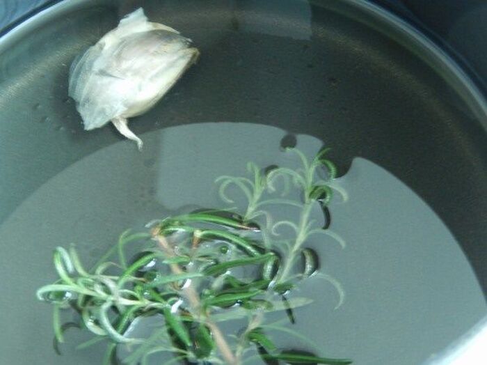 揚げオイルにローズマリーと皮付きのまま潰したにんにくをいれ